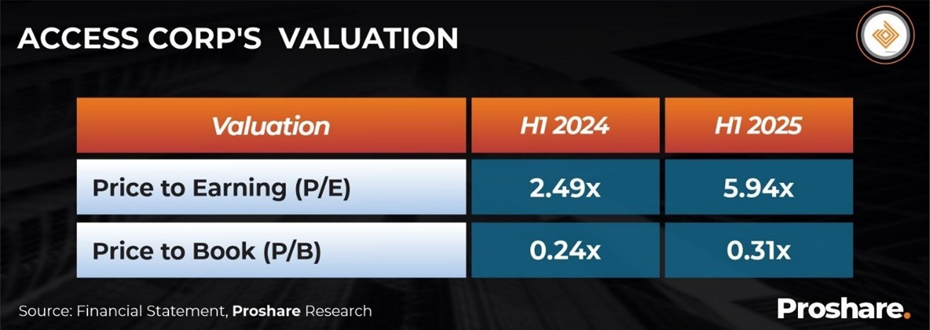 Access Holdings’ valuation remains attractive relative to its Tier-1 peers. The group trades at a price-to-earnings (P/E) ratio of 5.46x and a price-to-book (P/B) ratio of 0.31x, both below industry averages of 7.5x and 0.8x, respectively. This reflects a considerable undervaluation of the stock relative to its intrinsic worth, suggesting potential upside for investors with a medium to long-term horizon (see table 4 below).