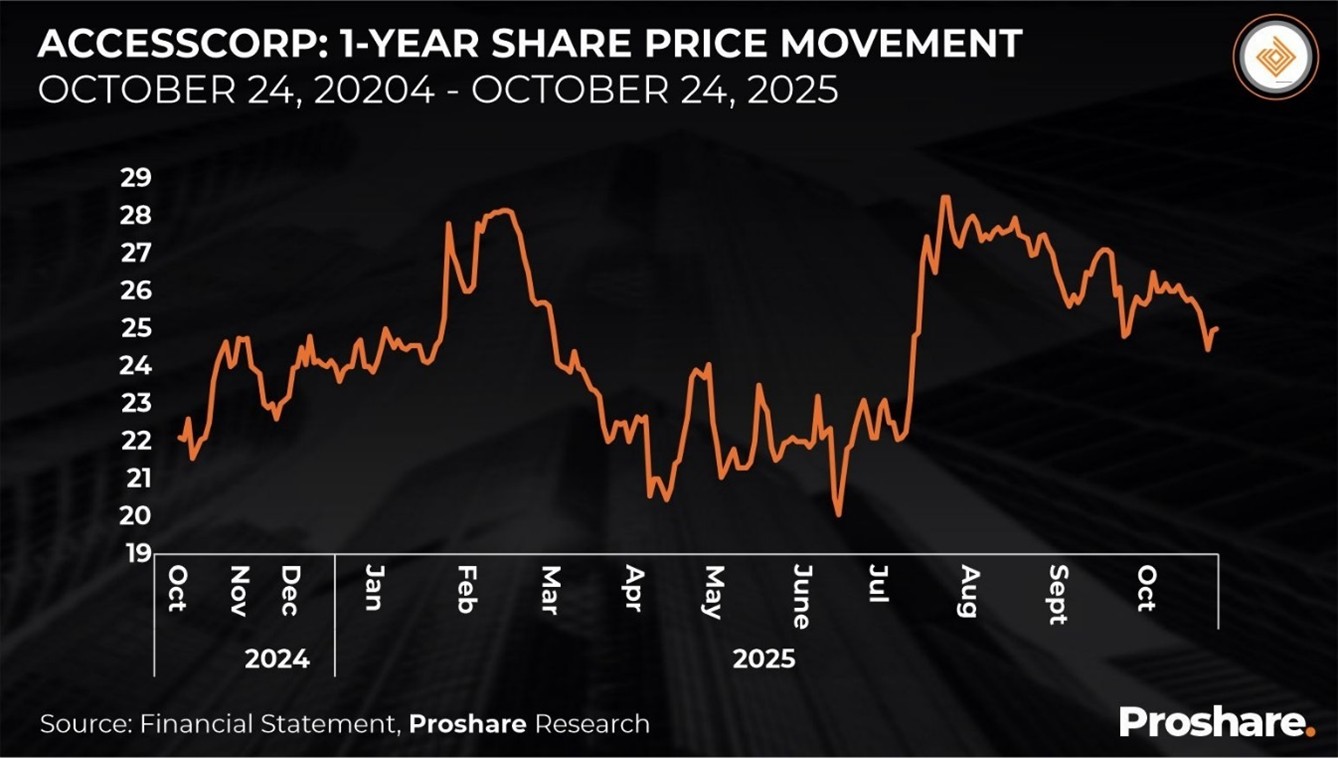 Access Holdings Plc’s share price exhibited a strong upward trajectory through late 2024 into early 2025, before stabilising mid-year and entering a mild consolidation phase. Over the twelve months under review, the stock traded between a low of N20.05 (June 2025) and a high of N28.50 (July 2025), reflecting a 52-week price spread of about 42.14%, underscoring both investor optimism and market volatility in the period.