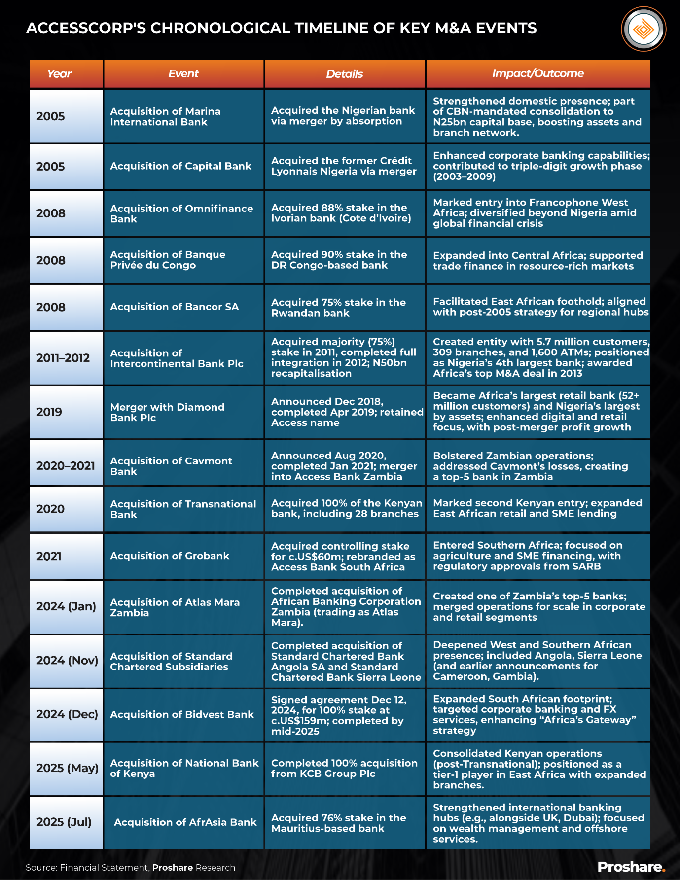 Amid economic challenges such as naira devaluation, AccessCorp has in recent times focused on deals in East and Southern Africa. While some of its subsidiaries were created through greenfield investments, updates for the transaction in 2025 may cover ongoing integrations. The timeline of events showed the group’s expansionary strategies as follows: