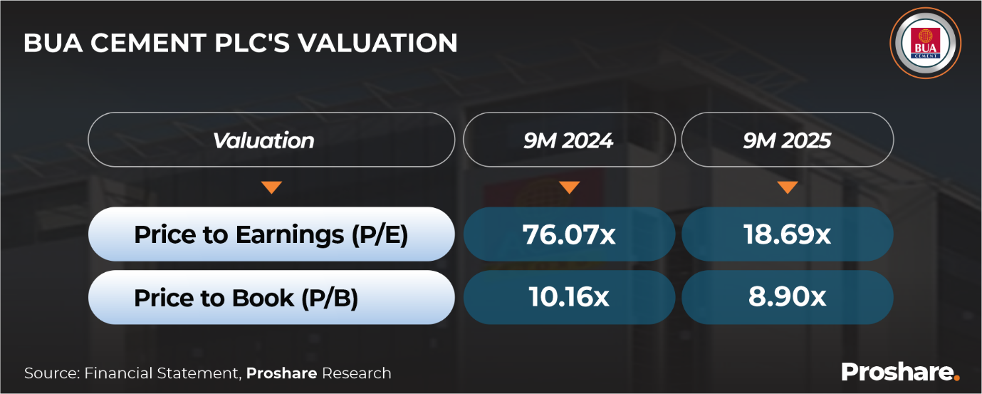 BUA Cement’s price-to-earnings (P/E) ratio declined to 18.69x in 9M 2025 from 76.07x in 9M 2025, while the price-to-book (P/B) ratio fell from 10.16x to 8.90x over the same period, suggesting room for further price appreciation given the earnings momentum and growth prospects (see table 3 below).