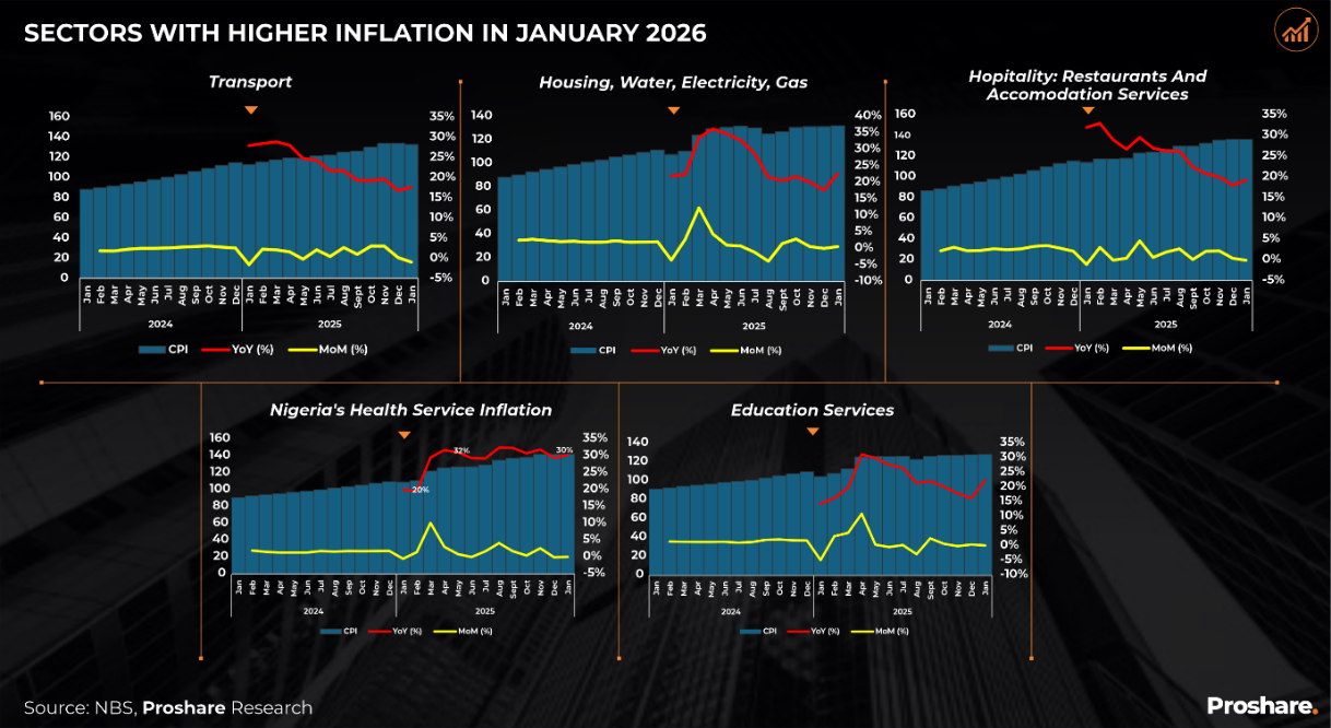 Headline inflation has now decelerated for eleven consecutive months, a track record that is not the product of base effects alone but reflects genuine demand compression and, critically, a stabilisation in the foreign exchange passthrough channel. The NBS reported that overall consumer prices moderated by approximately 5 percentage points in January 2026 from 15.155% at year-end 2025. Of the thirteen sectors in the NBS CPI basket, eight recorded deceleration, representing a combined weight of 55.7 index points, against five sectors still rising, with a combined weight of 44.3 points. The net disinflation signal, at 11.4 points, is unambiguous.