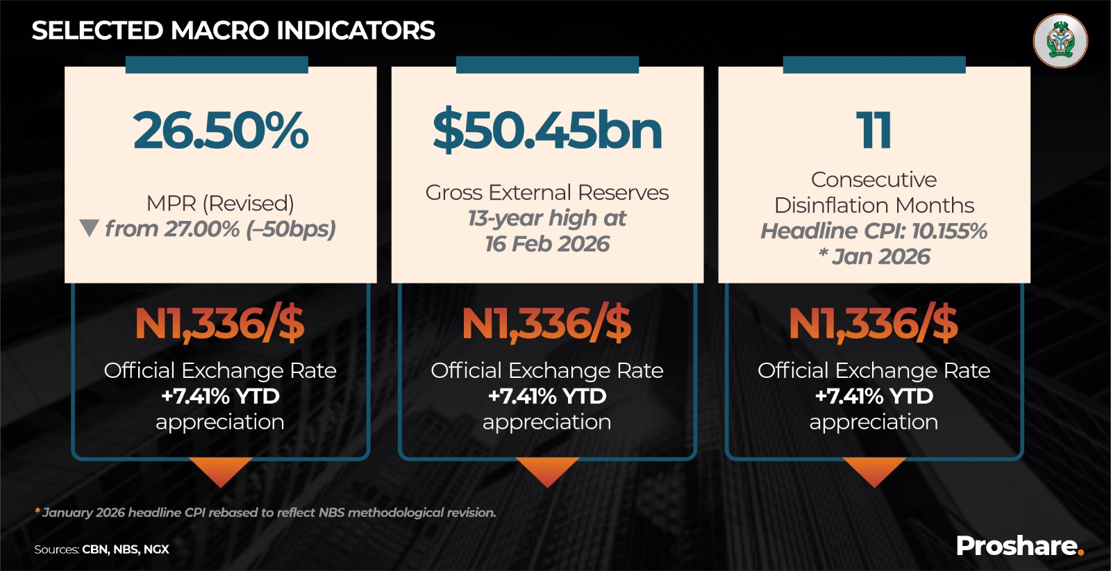 * January 2026 headline CPI rebased to reflect NBS methodological revision. Sources: CBN, NBS, NGX.