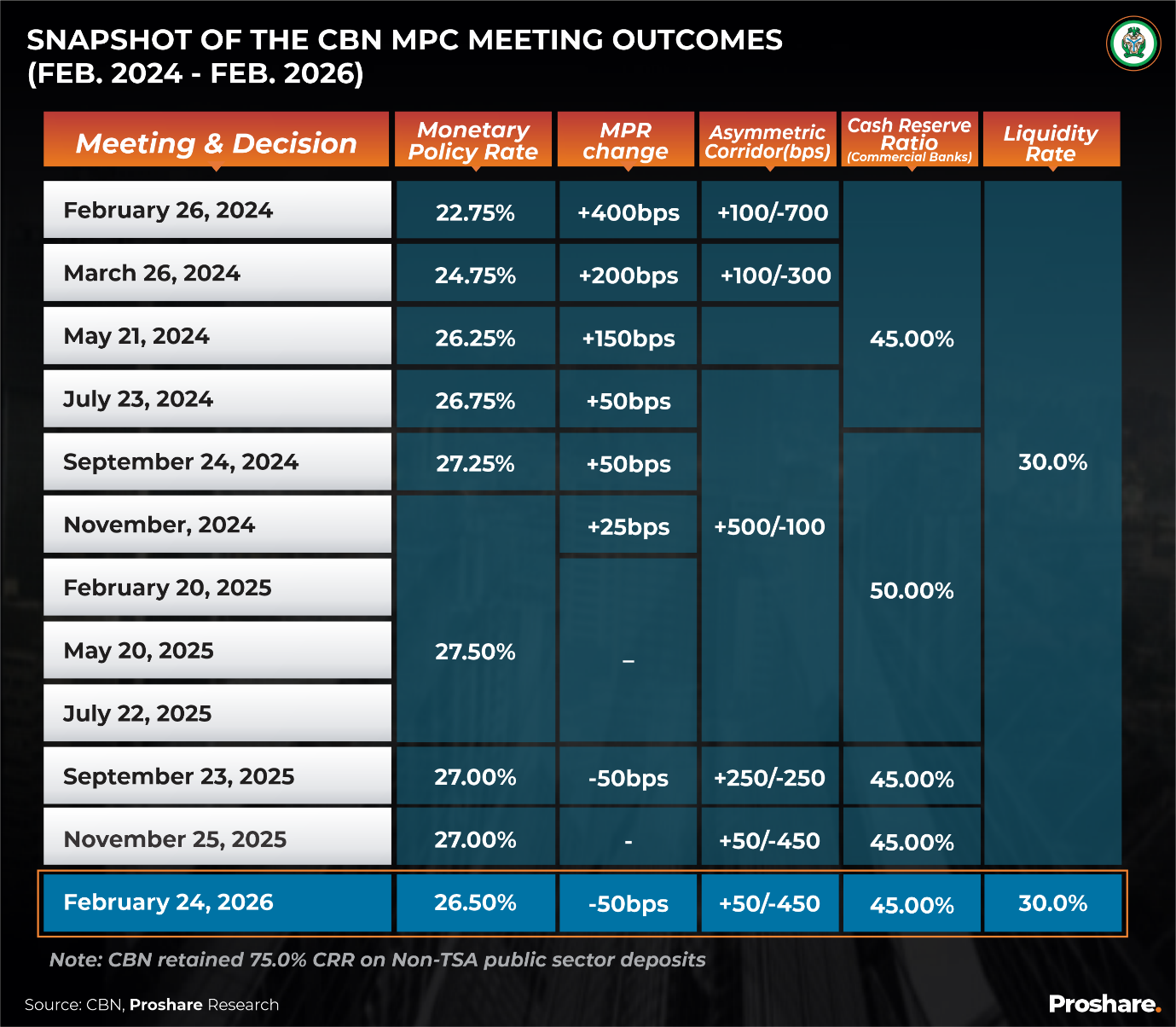 At the conclusion of its two-day sitting in February 2026, attended by eleven of twelve members, the CBN Monetary Policy Committee resolved as follows: