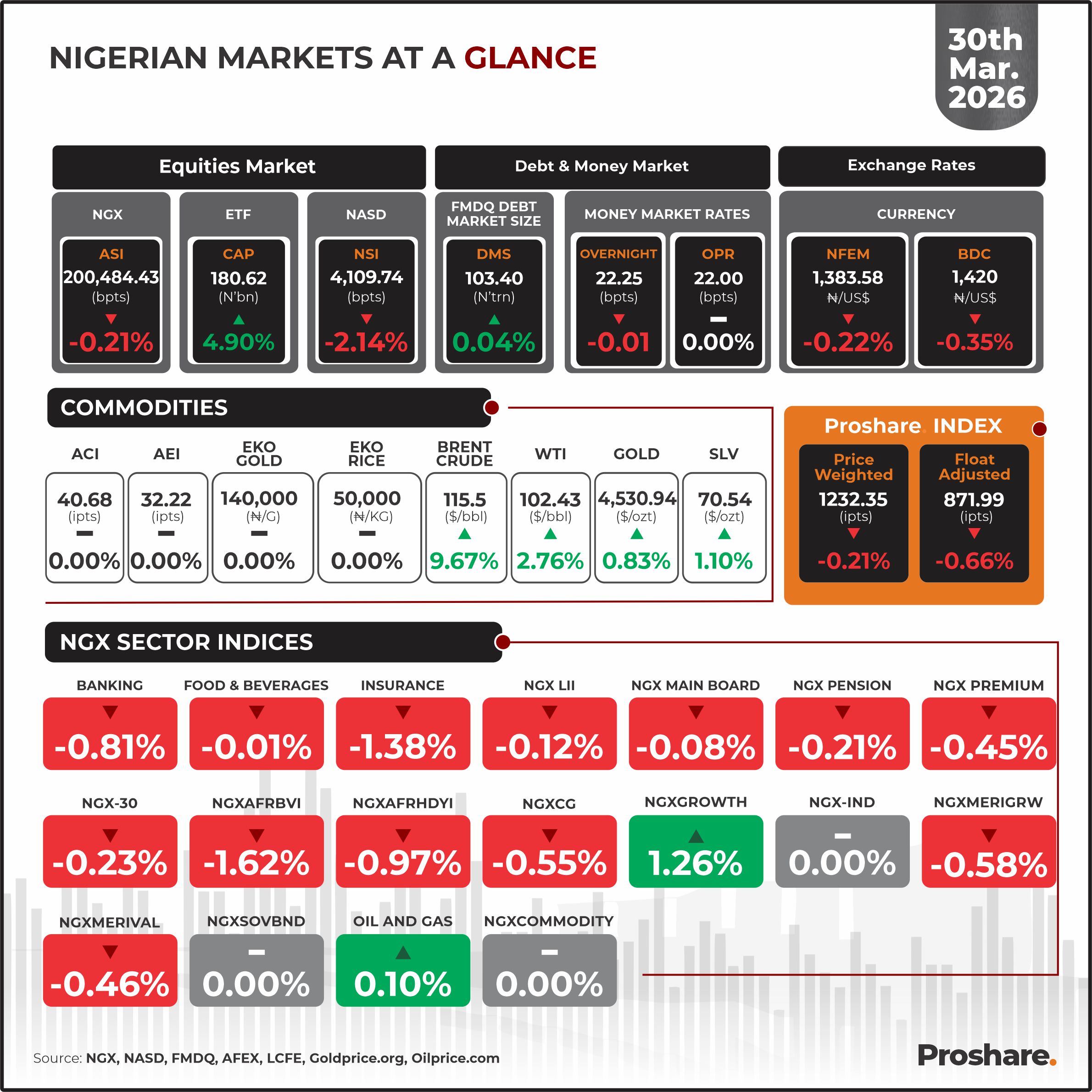 The Nigerian equities market closed Monday, March 30, 2026, on a negative note, extending the previous session’s losses, as investors selloff stocks like MAYBAKER (-9.42%), WAPCO (-3.26%), ZENITHBANK (-2.86%), DANGSUGAR (-2.79%), GTCO (-0.99%), WEMABANK (-0.76%), and 28 others. As such, the benchmark All-Share Index (ASI) fell 0.21% to settle at 200,484.43 points, down from 200,913.06 points on Friday.