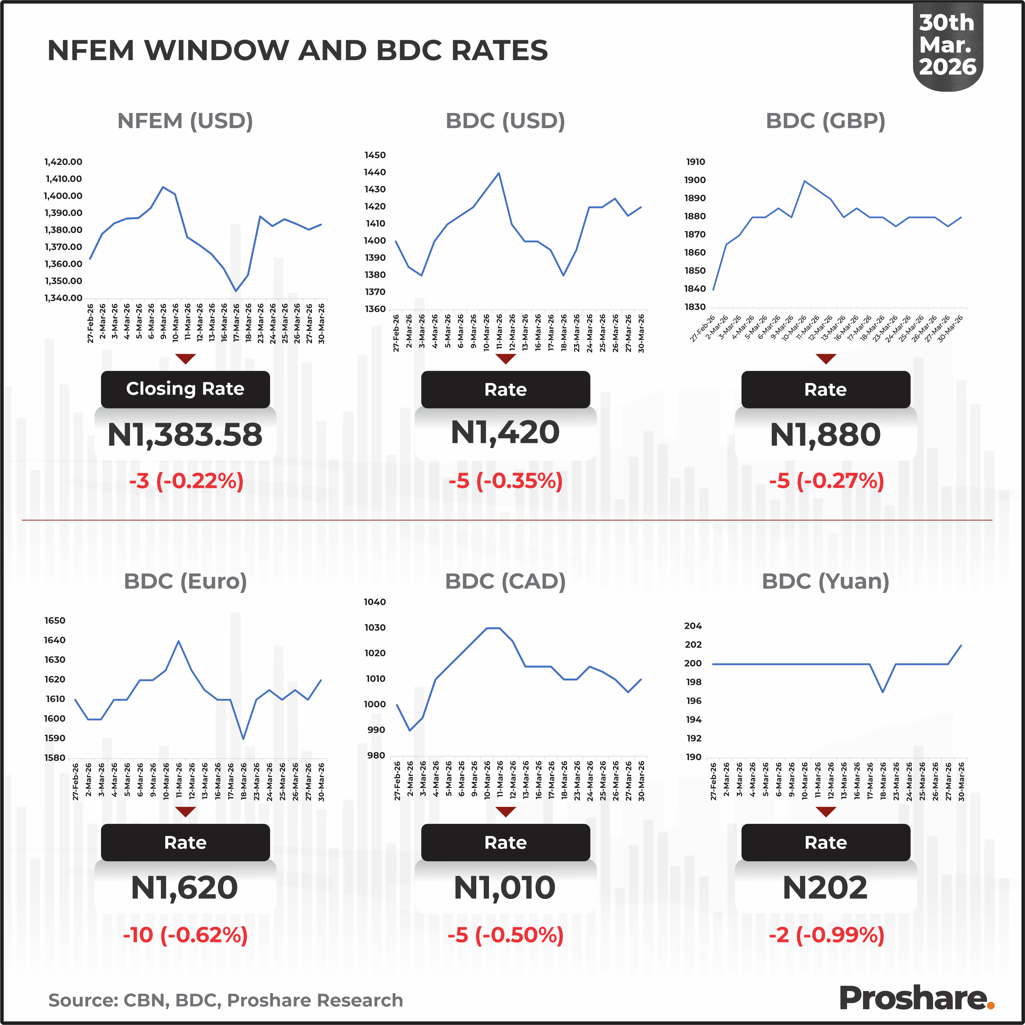 The average BDC rate depreciated 0.35% to N1,420/USD from N1,415/USD, while the NFEM rate closed at N1,380.58/USD in the last market day. For updates on the Nigerian FX Market, kindly click here.