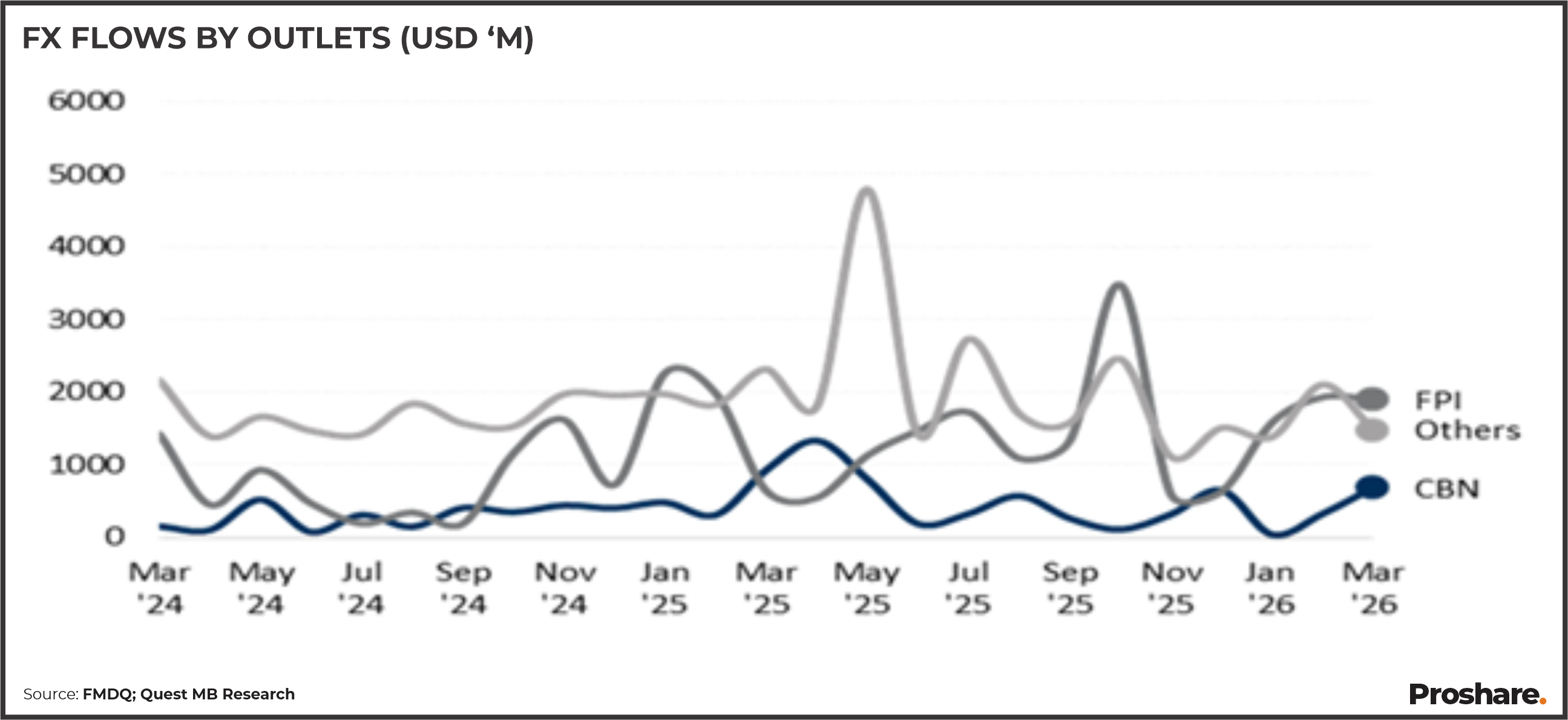 Figures released by the FMDQ, show that total foreign exchange (FX) inflows into the FX market fell by 7% month-on-month (MoM) to US$4.1bn in March 2026. The modest MoM reduction appears to reflect seasonal patterns, consistent with a similar 5% MoM decline recorded in March 2025. Although inflows from foreign portfolio investors (FPIs), which are the main source of FX supply, only dropped slightly during the month, the overall drop in FX liquidity was mainly due to a sharp fall in inflows from the local individuals’ segment, which fell to US$22.2m from US$697.8m the month before.
