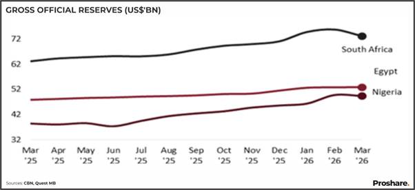 Central Bank of Nigeria (CBN) latest data on Nigeria’s external reserves, shows that gross external reserves declined modestly by US$398m to US$49.3bn as at end‑March 2026. This represents the first month-on-month (MoM) decline following eight consecutive months of reserve accretion since Jun ‘2025, during which the reserves increased cumulatively by US$12.5bn. The recent moderation appears largely attributable to seasonally stronger FX demand associated with import‑related activities. Notwithstanding this adjustment, the preceding build‑up, and the still‑robust level of reserves reflect the impact of ongoing FX reforms implemented by the CBN, which have supported improved market transparency and liquidity, contributing to a more effective and orderly FX market with better price discovery.