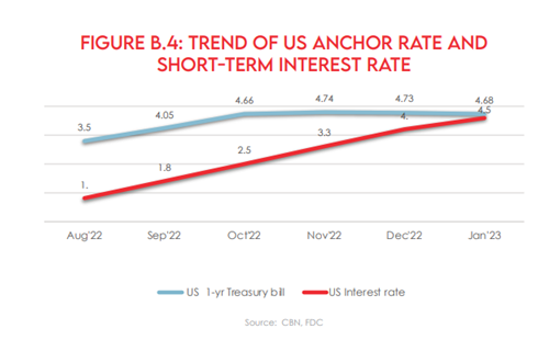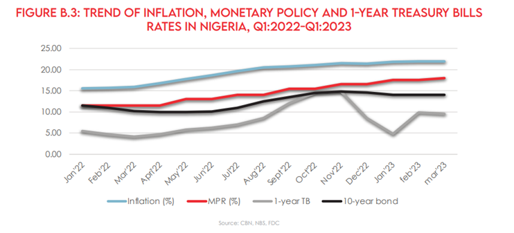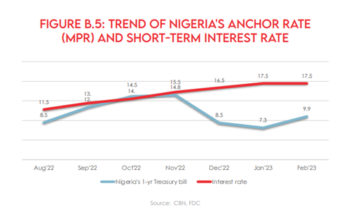 The effectiveness of monetary policy tools is largely dependent on the connectivity between the anchor rate and other nominal rates. The anchor rate in Nigeria is disconnected from the short-term interest rates and t-bill rates thus making monetary policy ineffective. Despite the monetary tightening measures of the CBN through six consecutive hikes in the MPR, money supply rose to 18.3% year-over-year in February 2023 from 17.2% in January 2023. Credit to businesses and consumers also increased to 16% year-over-year. Inflation increased to 21.91% year-over-year in February 2023 from 21.82% in January 2023.