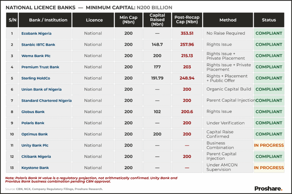 Polaris Bank Limited. Polaris Bank’s recapitalisation route and current capital structure remain under review, given its outstanding AMCON position and unresolved status. The compliance designation of N200 billion is a regulatory projection, not an arithmetically confirmed figure from publicly disclosed capital data. The current capital, as at the last available filing, is N50.40 billion. There is no new information to adjust the projection as of March 19, 2026. This is a CBN-regulated bank, and there is no verifiable information on its capitalisation status.