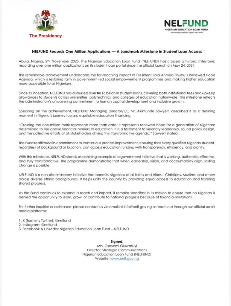 “With this milestone, NELFUND stands as a shining example of a government initiative that is working, authentic, effective, and truly transformative,” the statement reads.