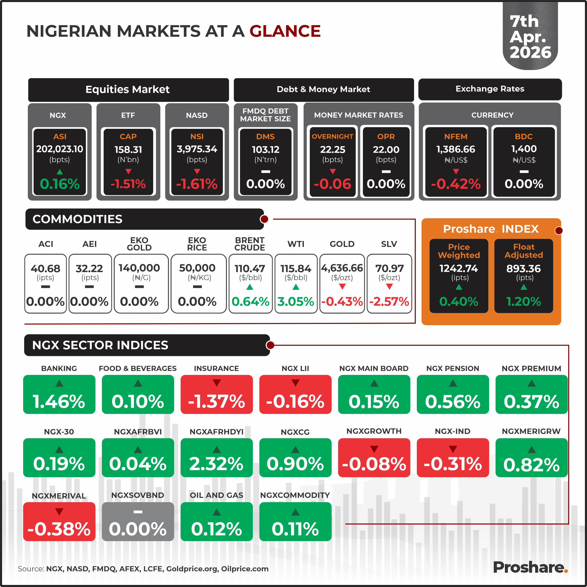 On Tuesday, 07 April 2026, the Nigerian stock market closed the first trading day of the week on a bright note, driven by strong demand for CADBURY (+9.53%), FIRSTHOLDCO (+9.10%), HONYFLOUR (+4.00%), NGXGROUP (+3.03%), GTCO (+2.46%), STANBIC (+1.43%), WAPCO (+0.47%), ARADEL (+0.40%), ACCESSCORP (+0.19%), and 15 others. As such, the benchmark All-Share Index (ASI) increased 0.16% to settle at 202,023.10 points on Tuesday, up from 201,698.89 points on Thursday.