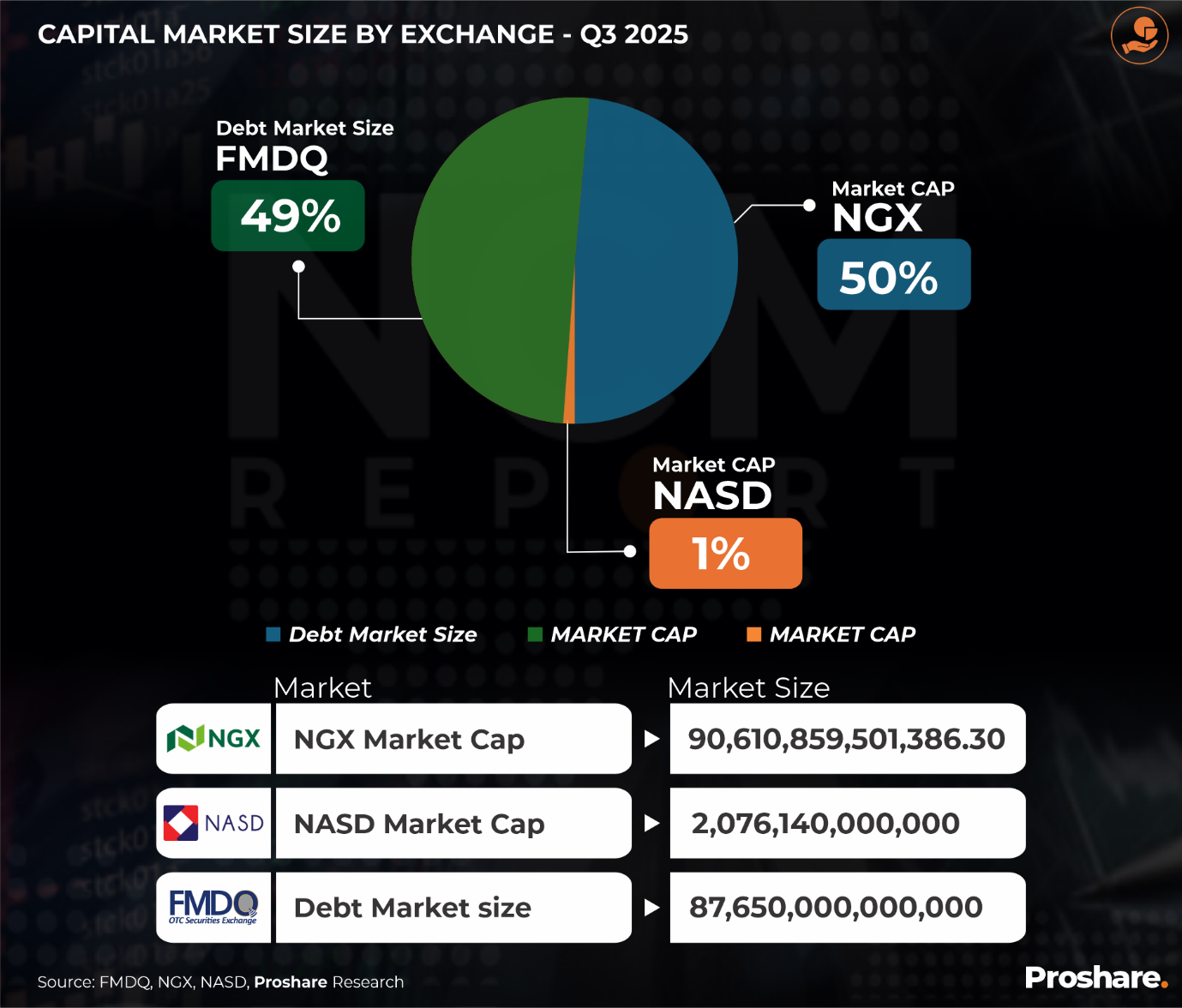 The Nigerian capital market closed the third quarter of 2025 with a combined market size dominated by the NGX equities market, which accounted for 50% with a total size of N90.61trn. The FMDQ Debt Market followed, representing 49% with a market capitalisation of approximately N87.65trn, while the NASD OTC Securities Exchange accounted for 1% with a market size of N2.08trn. Analysts note that the balance between equities and debt reflects growing investor confidence, while the NASD continues to offer alternative investment opportunities for private companies seeking capital access (see chart below)