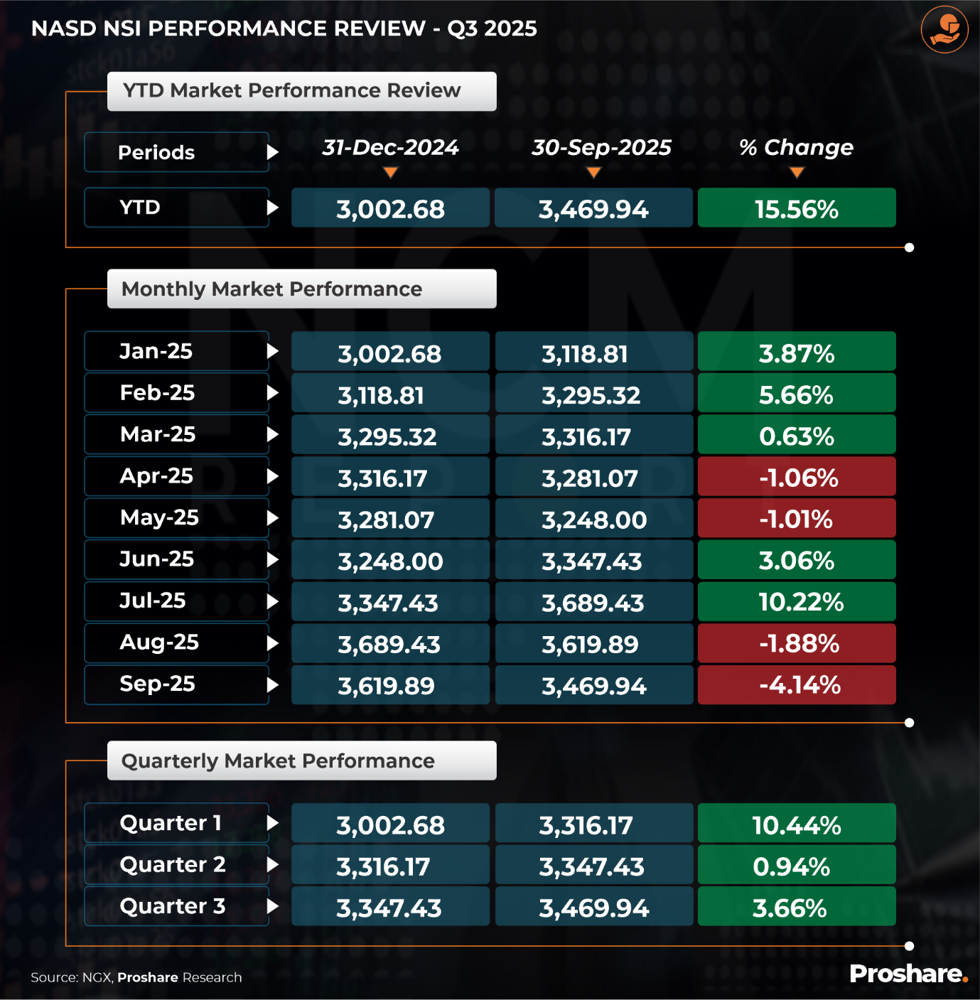 The NASD OTC Securities Exchange saw a strong performance in Q3 2025, with the NASD Securities Index (NSI) closing at 3,469.94 points, a 15.56% year-to-date (YTD) increase from 3,002.68 points. The first quarter was particularly robust, featuring gains of 3.87% in January, 5.66% in February, and 0.63% in March. This upward trend indicates growing investor confidence and positive market conditions in the early part of 2025.
