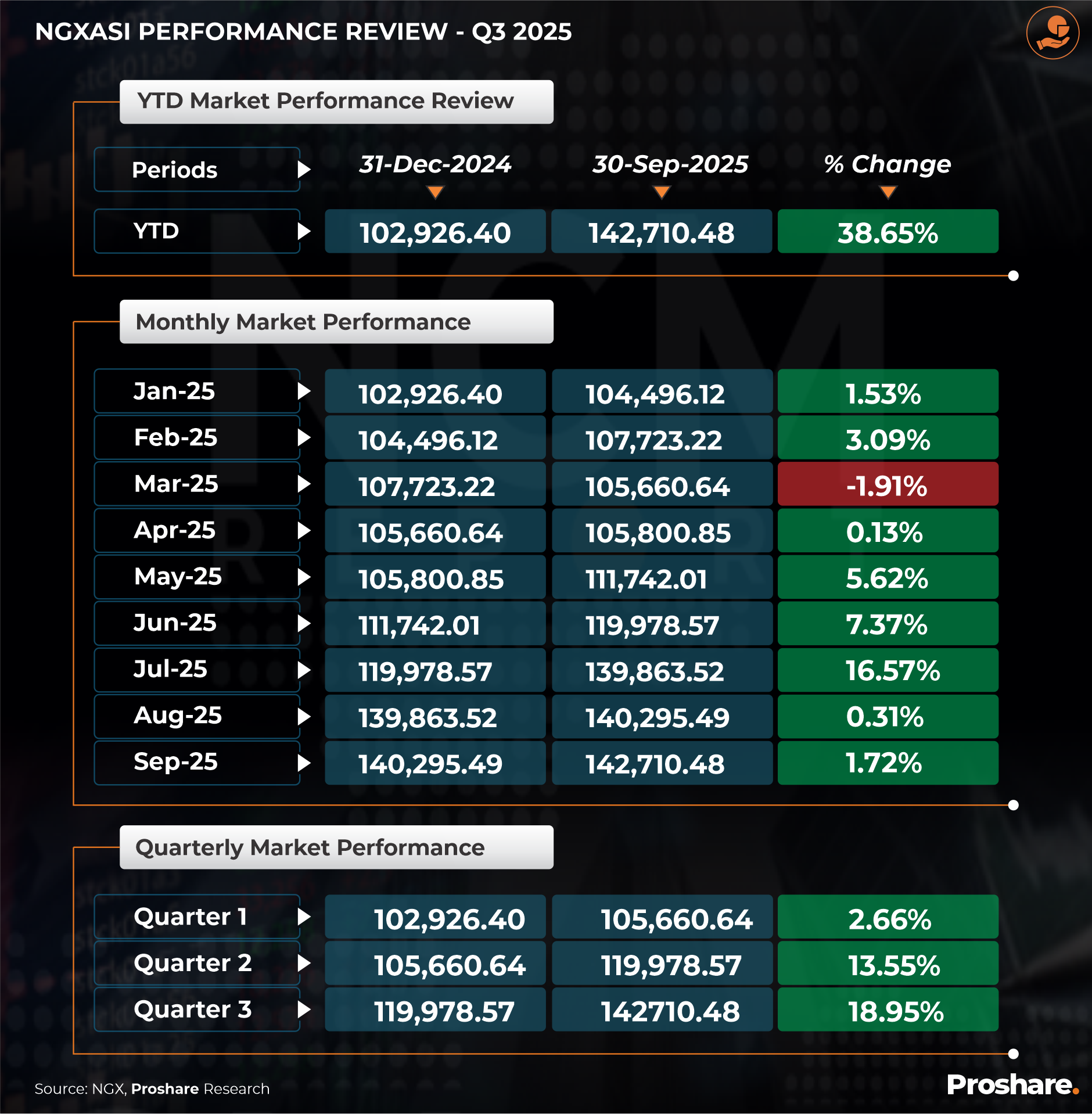 The Nigerian equities market remained bullish in Q3 2025, with the NGX All-Share Index (NGXASI) rising 18.95% to close the quarter at 142,710.48 points, up from 119,978.57 points in June 2025. Analysts noted the strongest quarterly performance of the year so far, bringing the market’s year-to-date (YTD) return to 38.65%. The year began positively, with a cumulative growth of 2.66% in Q1, driven by gains of 1.53% in January and 3.09% in February. However, March saw a slight correction with a 1.91% decline, primarily due to profit-taking amidst policy uncertainties.
