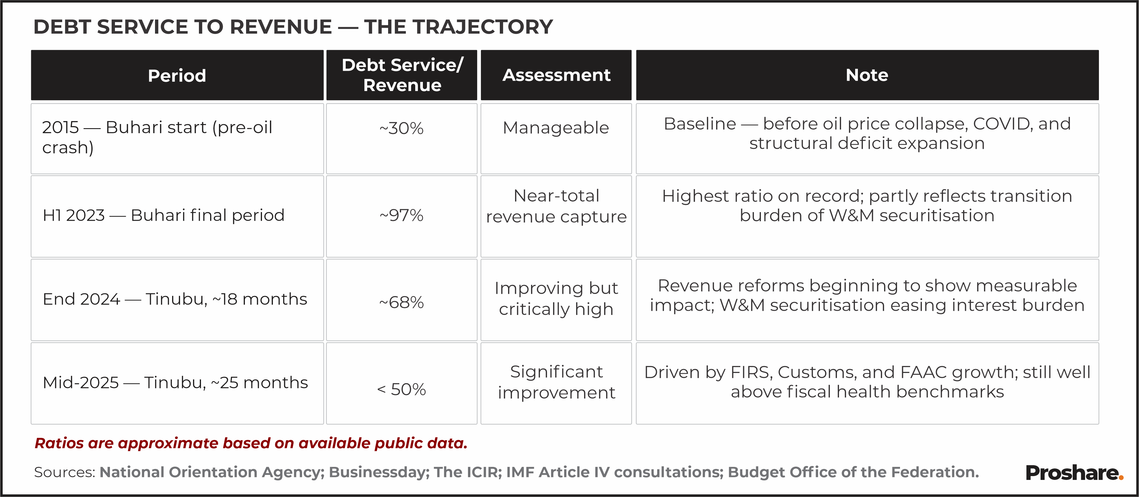 Sources: National Orientation Agency; Businessday; The ICIR; IMF Article IV consultations; Budget Office of the Federation. Ratios are approximate based on available public data.