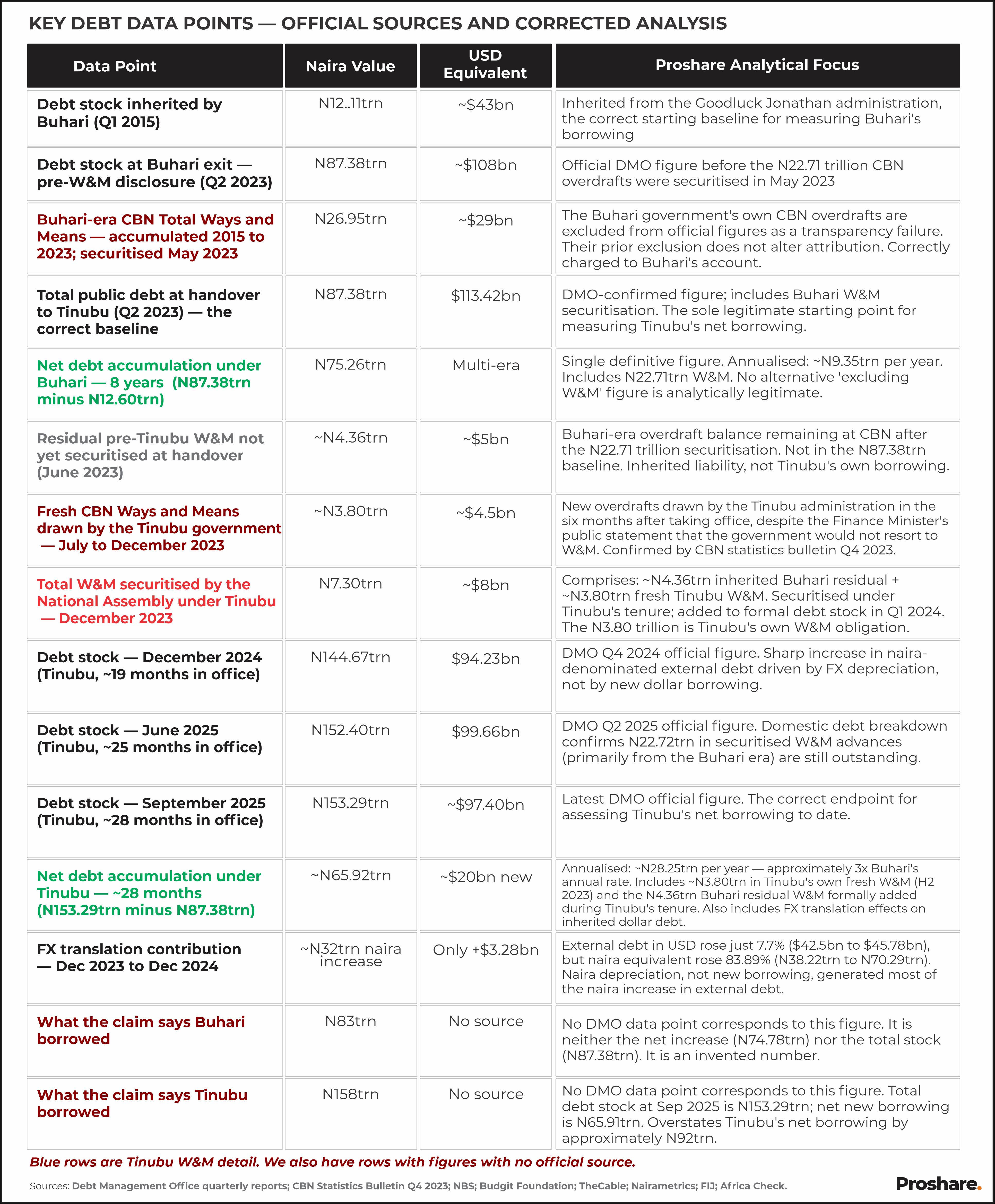 Sources: Debt Management Office quarterly reports; CBN Statistics Bulletin Q4 2023; NBS; Budgit Foundation; TheCable; Nairametrics; FIJ; Africa Check. Blue rows are Tinubu W&M detail. We also have rows with figures with no official source.