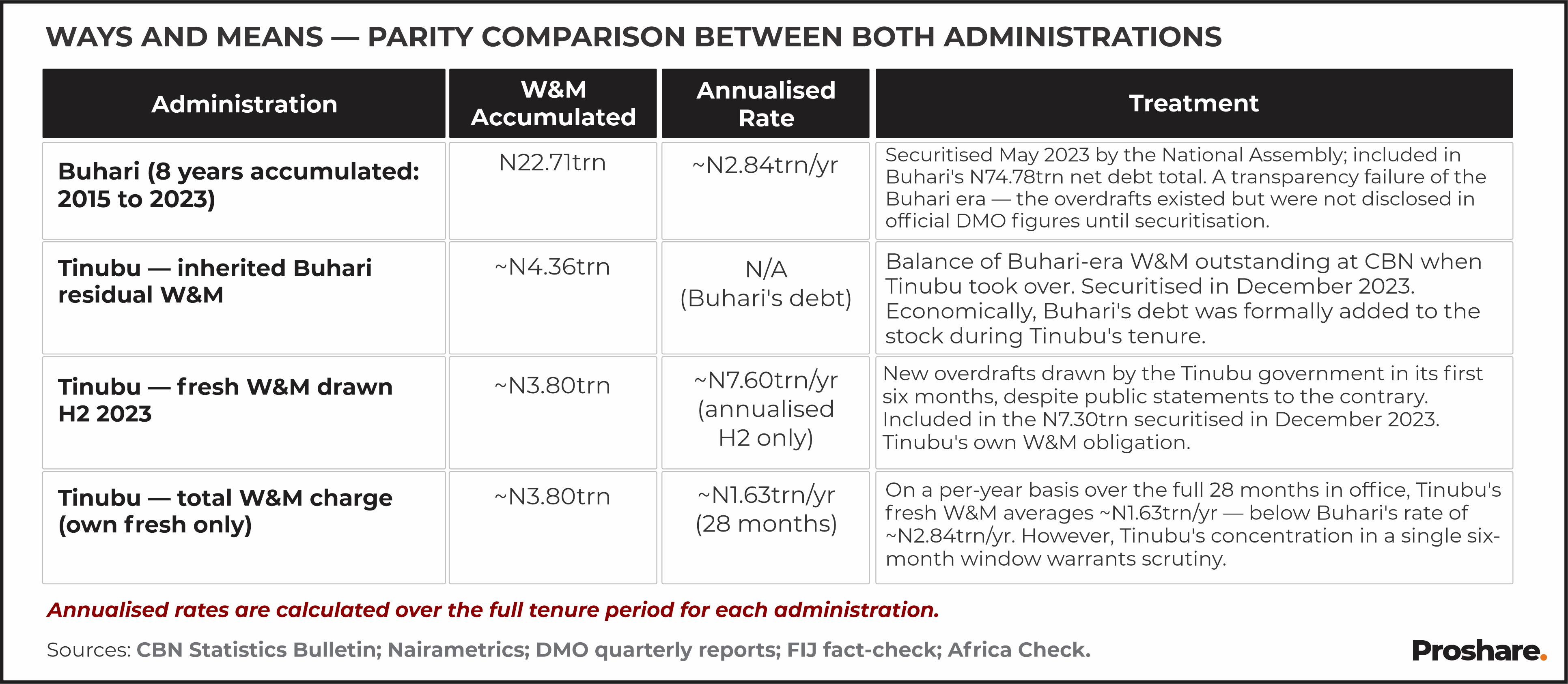 Tinubu’s fresh W&M (~N1.63trn annualised over 28 months) is below Buhari’s W&M rate (~N2.84trn per year), but its concentration in a single six-month window and the breach of the statutory CBN Act limit warrant the same transparency applied to Buhari’s overdrafts.