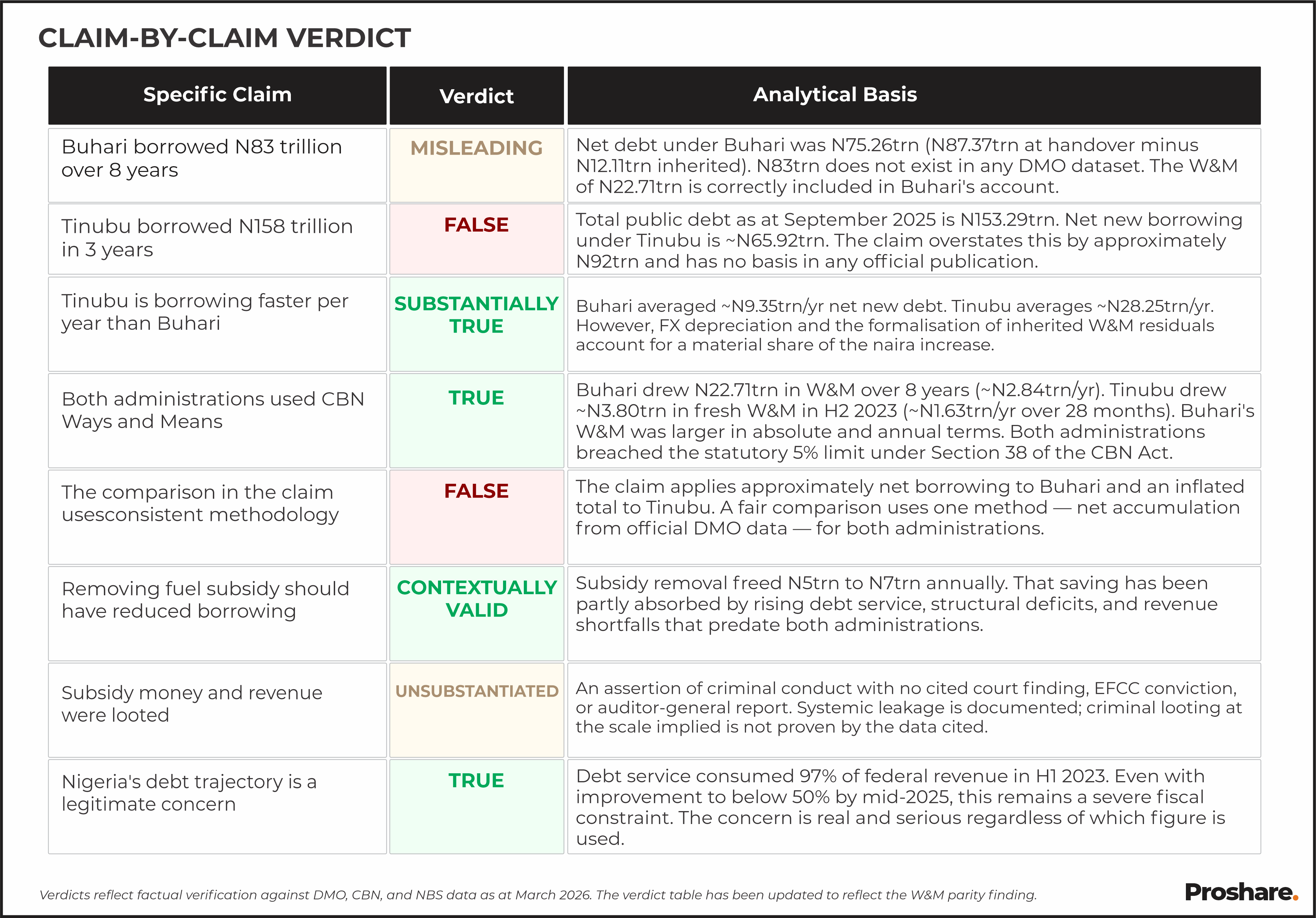 Verdicts reflect factual verification against DMO, CBN, and NBS data as at March 2026. The verdict table has been updated to reflect the W&M parity finding.