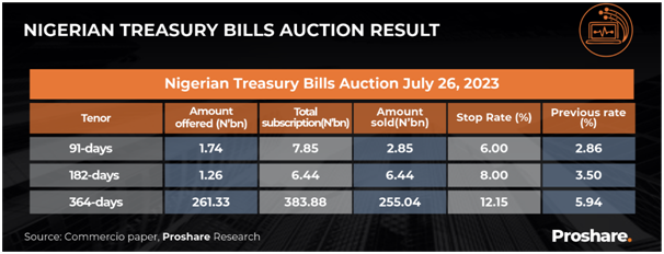 The treasury bill stop rate responded to the Central Bank Monetary Policy Committee (MPC) Monetary Policy Rate (MPR) increase for the first time in months, in contrast to previous auctions in 2023. Despite the 200bps rate hike from January to May 2023, the NTB stop rate declined aggressively, with the 365-day falling below double digits due to robust liquidity driving subscriptions, thereby neutralizing stop rate increases. At the NTB auction held on July 26, 2023, the stop rate spiked to 6.00%, 8.00%, and 12.15% for the 91-day, 182-day, and 364-day from 2.86%, 3.50%, and 5.94% recorded at the previous auction (July 12, 2023). The subscription for the NTB auction came in higher at N398.17bn with a spread of N7.85bn, N6.44bn, and N383.88bn for the 91-day, 182-day and 364-day tenors contrary to N264.33bn offered by DMO. However, the DMO sold the exact amount offered of N264.33bn, but with a slight adjustment in the spread, 91-day and 182-day allotments settled at N2.85bn and N6.44bn higher than N1.74bn and N1.26bn offered while 364-day allotment dipped to N255.04bn from N383.88bn offered. The positive adjustment in rates should spur massive demand in the secondary market today, rescinding investors’ cautious approach (see Table 1 below).