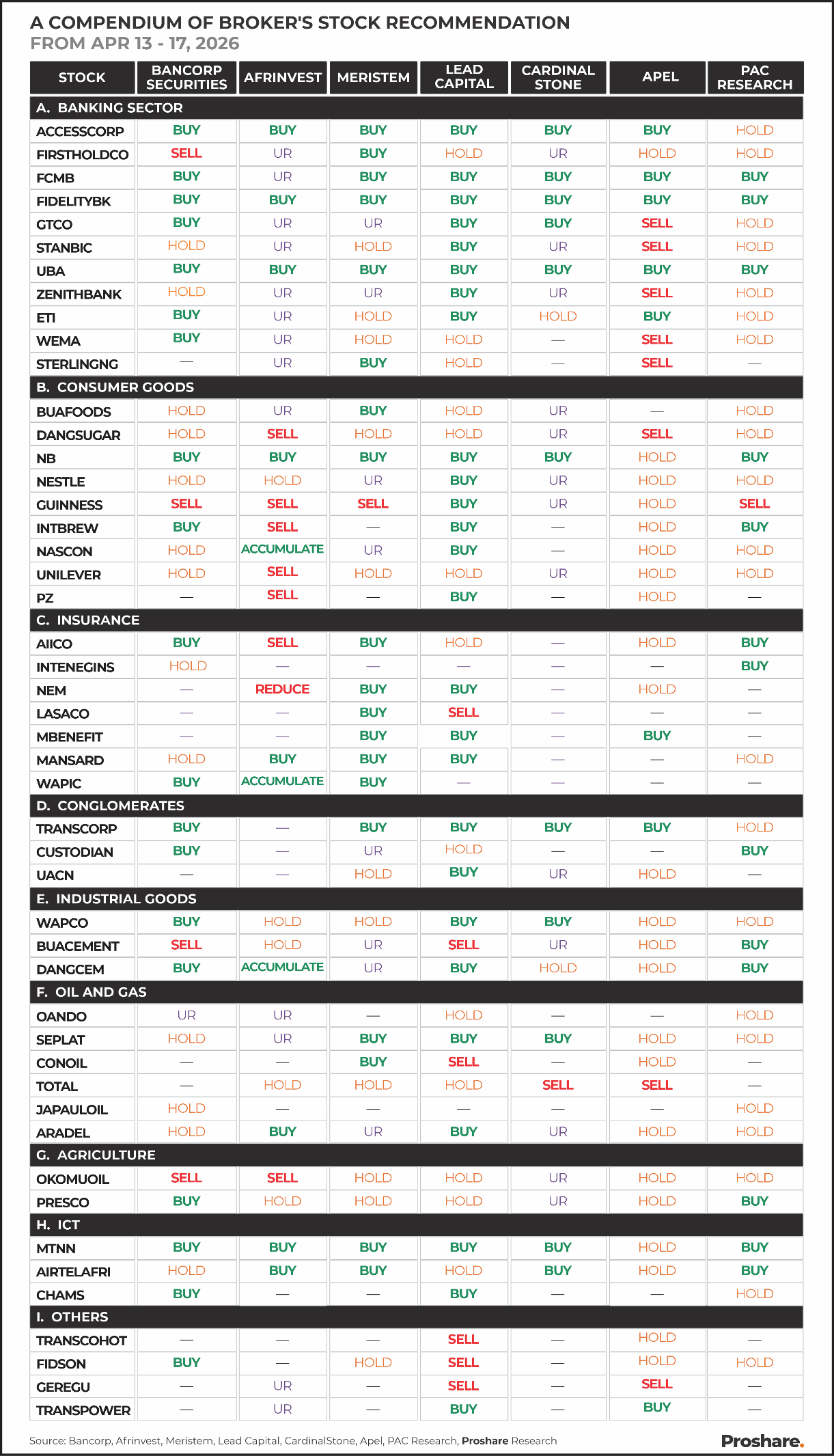 Insurance is the sector generating the most positive revision activity, with MANSARD and MBENEFIT both attracting Buy upgrades, suggesting that fundamental visibility in that segment is improving even as the Insurance Index posted its second consecutive weekly loss. In oil and gas, SEPLAT’s re-entry to Buy coverage at Meristem is the week’s most consequential positive rating event, while PAC Research’s moderation of OANDO and ARADEL to Hold reflects a similar valuation-to-price tension observed elsewhere.