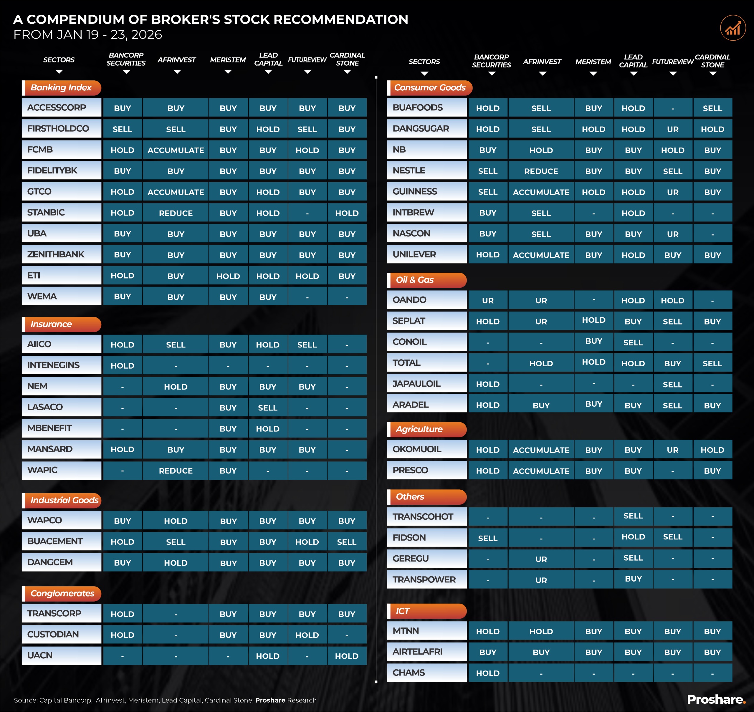 In the consumer goods sector, Capital Bancorp downgraded its recommendation for NESTLE from “Hold” to “Sell”, projecting a maximum expected return of at most -10.5%. Afrinvest has similarly revised its view on NB, moving from “Accumulate” to “Hold”, with an expected return capped at 10%, reduced from 25%. It has also adjusted NESTLE’s rating from “Hold” to “Reduce”, forecasting a potential decline of up to -10%. Additionally, Afrinvest has upgraded a previous “Sell” recommendation to “Accumulate”, suggesting a return of 10% to 25%. Meanwhile, Lead Capital has upgraded its outlook on NASCON from “Hold” to “Buy”, signalling greater confidence in the company’s prospects.