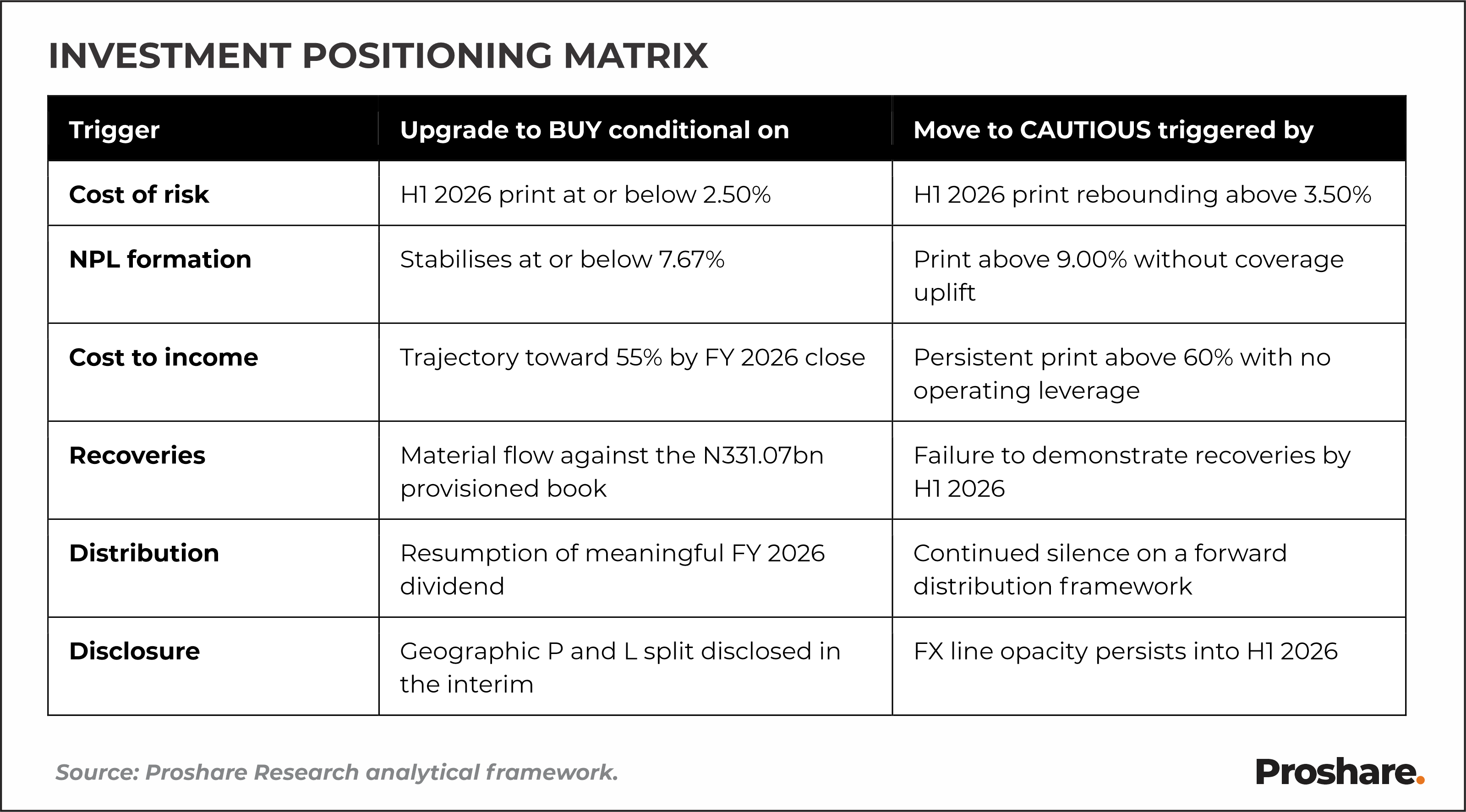 The medium-term repricing is supported by four specific drivers that the Proshare market intelligence unit is monitoring. The first is the cost-of-risk trajectory through H1 2026 and FY 2026, with a sustained print below 2.50% required to validate the reset. The second is the recoveries pipeline against the N331.07bn provisioned book, where a realistic 20% to 30% recovery rate over eighteen months would imply an N66bn to N99bn earnings uplift through the write-back mechanism alone. The third is the cost-to-income ratio trajectory, where a move from the Q1 2026 ratio of 61.20% back toward 55% or below would confirm that FY 2025 cost pressure was cyclical rather than structural. The fourth is the pace of risk asset redeployment, where sustained double-digit loan growth through FY 2026 against the 23.20% capital adequacy headroom would translate balance sheet capacity into net interest income uplift.