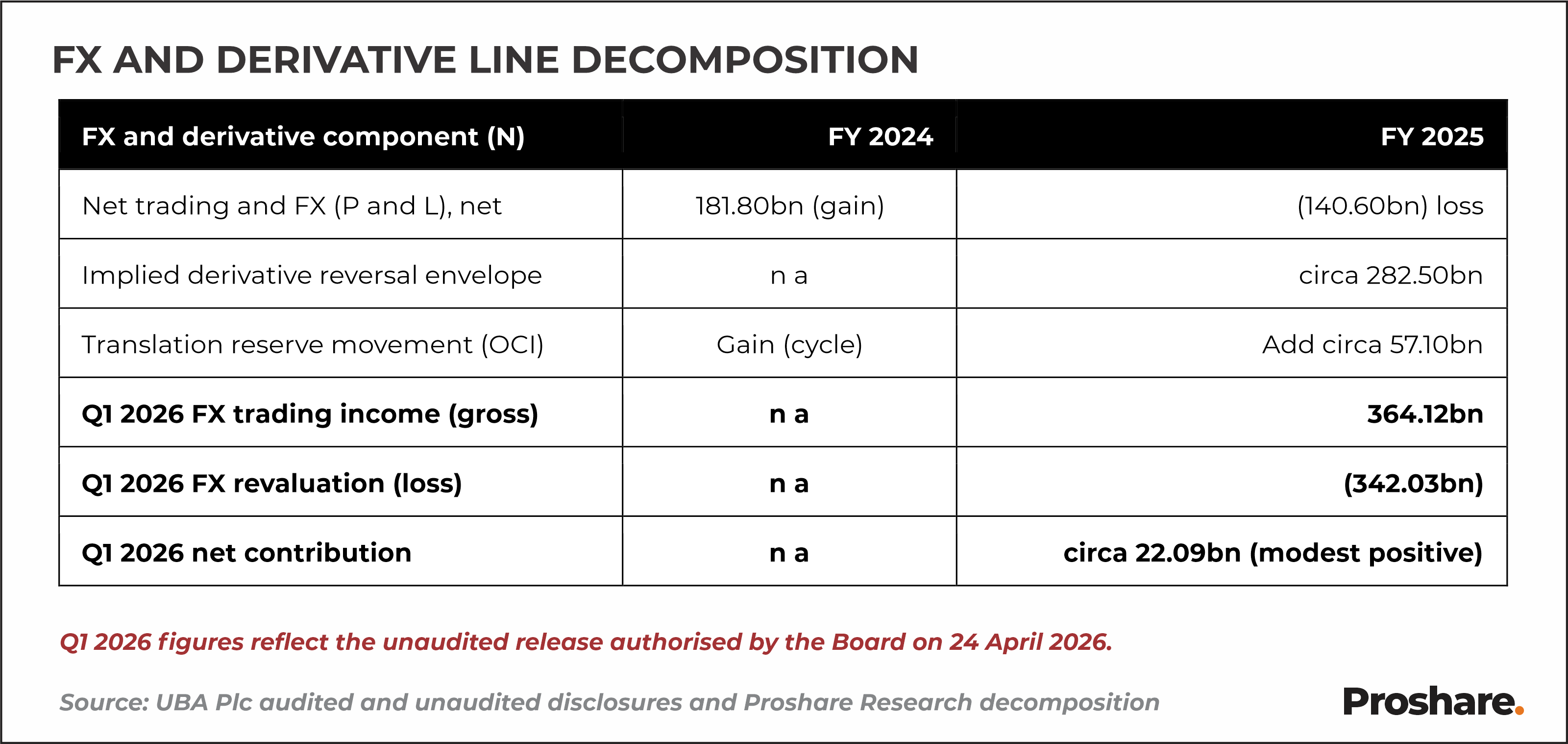 The first component is client-driven trading flow, the genuine and repeatable revenue earned from customer FX execution. The Pan African corporate franchise consistently generates this flow, and the Q1 2026 disclosure of N364.12bn in foreign exchange trading income, even before netting, confirms that the underlying client engine is intact. The second component is the revaluation of open trading positions and treasury balances at the prevailing exchange rate as of the reporting date. In FY 2024, the naira devaluation cycle drove an outsized revaluation gain on these balances. In FY 2025, as the exchange rate stabilised, those revaluation gains evaporated and, in some cases, were reversed for positions carried over into a more stable rate environment. The third component is the translation effect on non-Naira subsidiary income and balance sheets, which flows partly through OCI rather than the income statement, adding approximately N57.10bn to the FY 2025 translation reserve movement and contributing to total comprehensive income of N558.20bn.