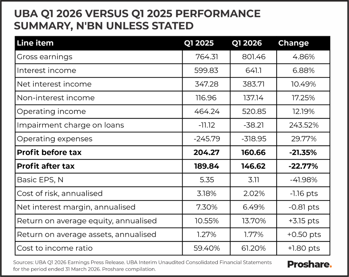 Profit before tax of N160.66bn for Q1 2026 is 21.35% lower than the Q1 2025 comparator of N204.27bn, and profit after tax of N146.62bn is 22.77% lower than N189.84bn. This reads as a soft headline at face value, but warrants a considered interpretation. The Q1 2025 comparator carried approximately N18.70bn in net foreign exchange-related gains that flattered the base period, and the Q1 2026 impairment charge of N38.21bn is more than three times the Q1 2025 charge of N11.12bn in absolute terms. Adjusting both quarters for non-recurring items reveals an underlying trajectory that is broadly flat to modestly up, consistent with a normalising earnings environment post recapitalisation. Basic earnings per share at N3.11, down from N5.35 in Q1 2025, also reflect the enlarged share count following the rights issue.