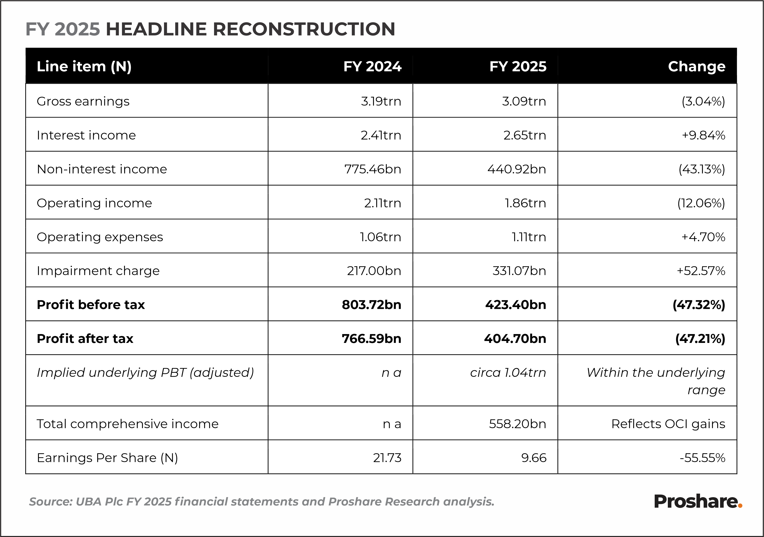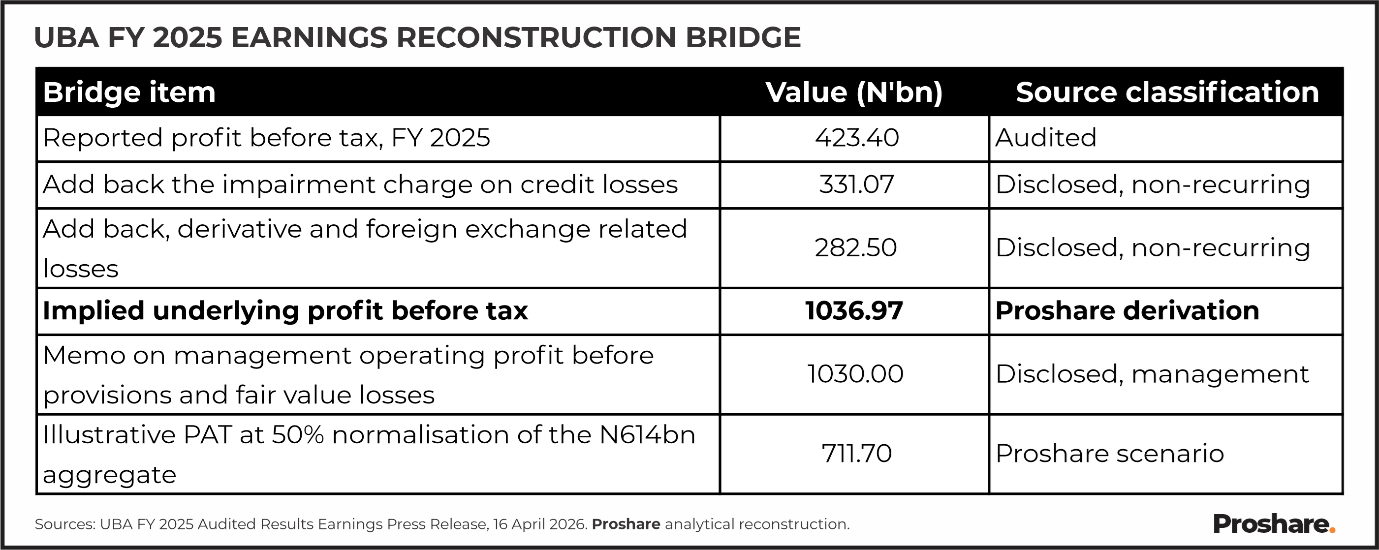 The Proshare earnings reconstruction adds back the N331.07bn impairment charge and the N282.50bn derivative and foreign-exchange-related loss, both identifiable and non-recurring, to arrive at an implied underlying profit before tax of approximately N1.04trn, a figure that converges with management’s own disclosed operating profit of N1.03trn before these items. The convergence is meaningful because it reframes the headline, as the reported compression is primarily the result of two identifiable factors rather than a structural impairment of the franchise.