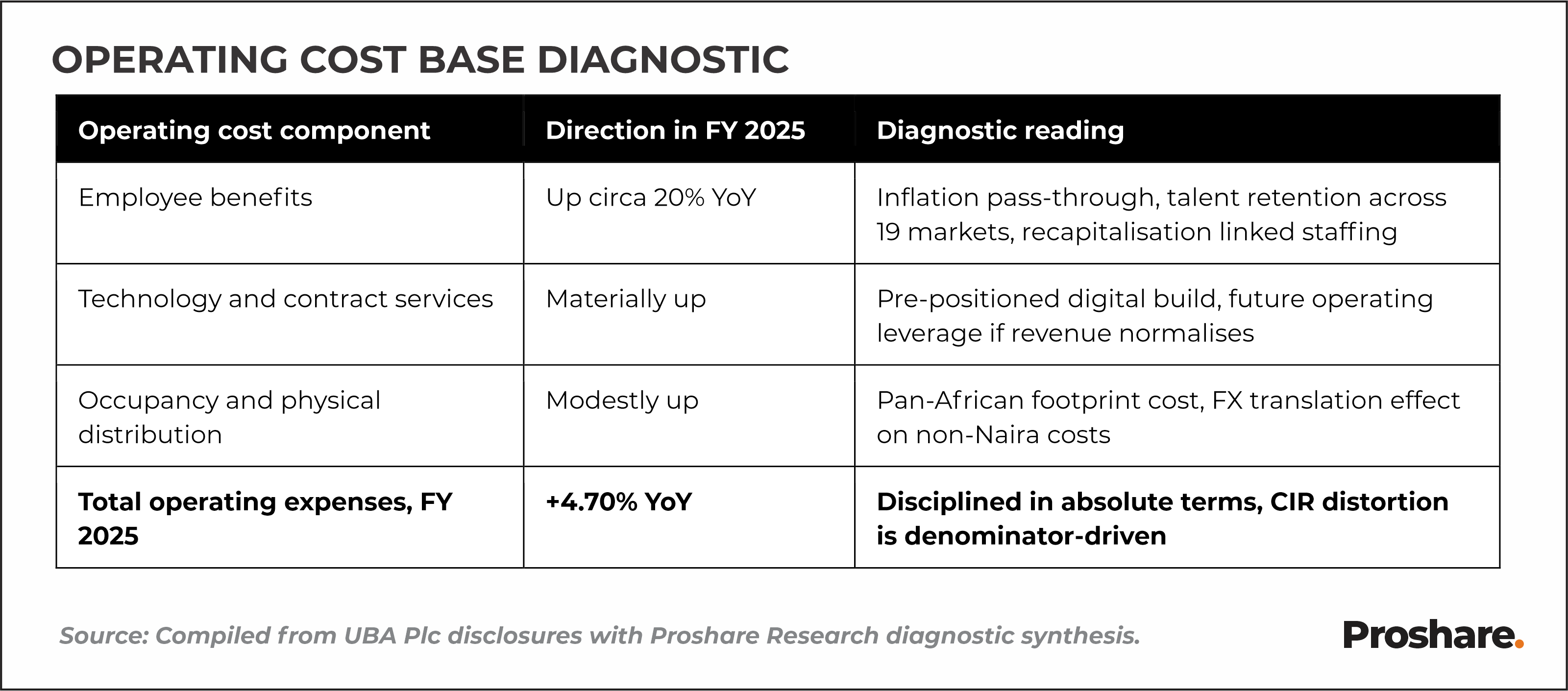 The FY 2025 cost-to-income ratio of 59.39%, compared with 49.50% in FY 2024, is above the level appropriate for UBA’s Group scale and Pan-African footprint. The diagnostic question is whether this is a denominator effect, a numerator effect, or both.