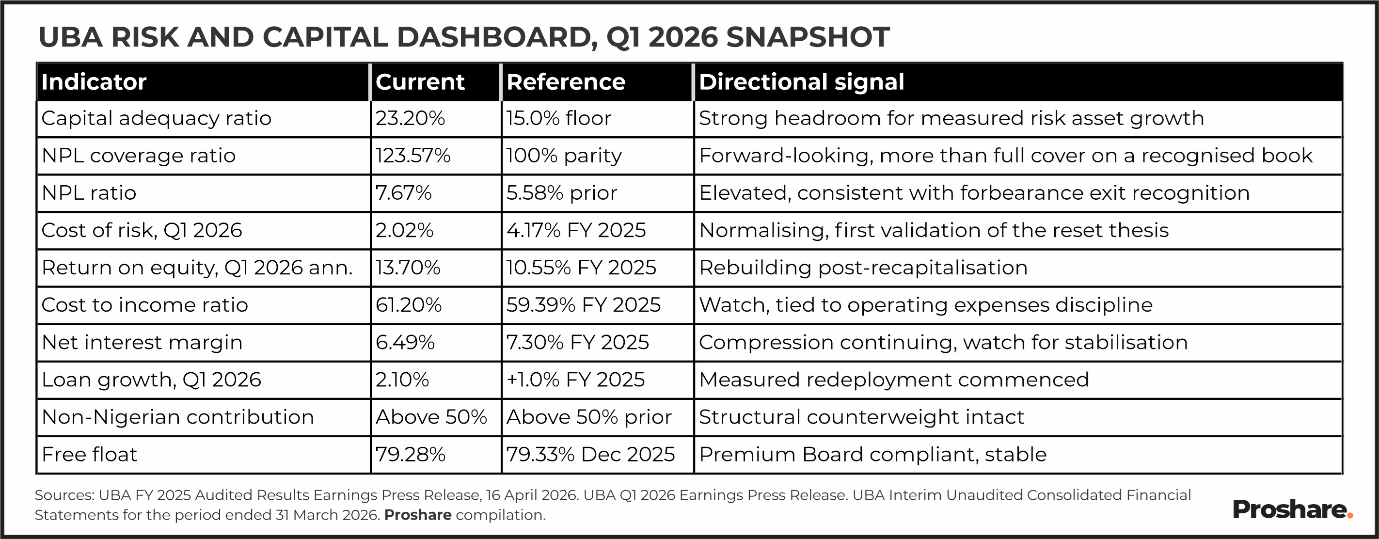 None of these clusters reflect an idiosyncratic UBA exposure. They are the systemic clusters that any tier-one Nigerian bank with a representative loan book would have absorbed within the same window. The key concern is whether the Nigeria entity returns to growth on a cleaner book once the forbearance exit is complete or continues to run a smaller book with higher coverage. The Q1 2026 loan growth of 2.10% Group wide suggests the former, but the Nigeria-specific trajectory through H1 2026 will be the cleaner test.